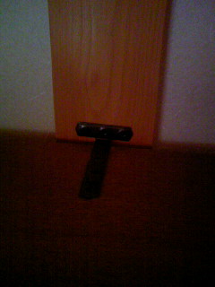 上のようなつけ方は見た目が嫌・・という場合(もしくは上のグッズと併用)、こうしてT型の金具で直接柱と固定しています。(暗くて見にくいですね