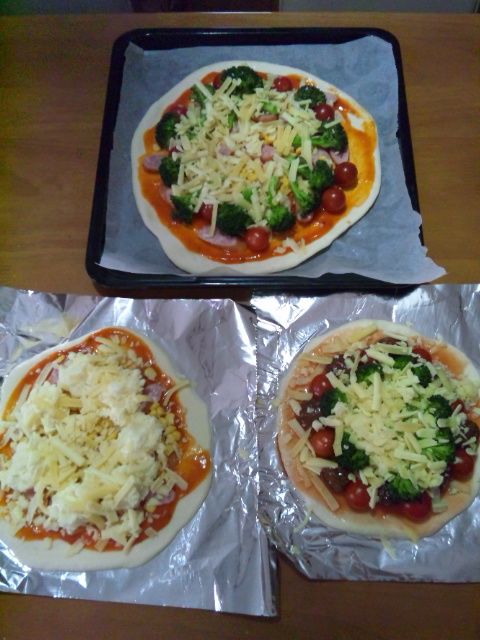 上のはブロッコリーとトマトとウインナーのピザ