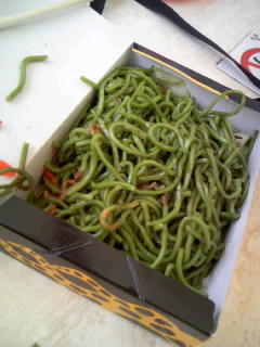 お腹がすいたので、目の前にあった焼きそばを買ってみたら、なんと緑色の麺でした